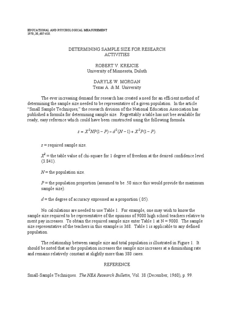 The nea research bulletin, vol. (1970) determining sample size for research activities. Determining sample size for research activities. To address the existing gap, krejcie & morgan (1970) came up with a table for determining sample size for a given population for easy reference .